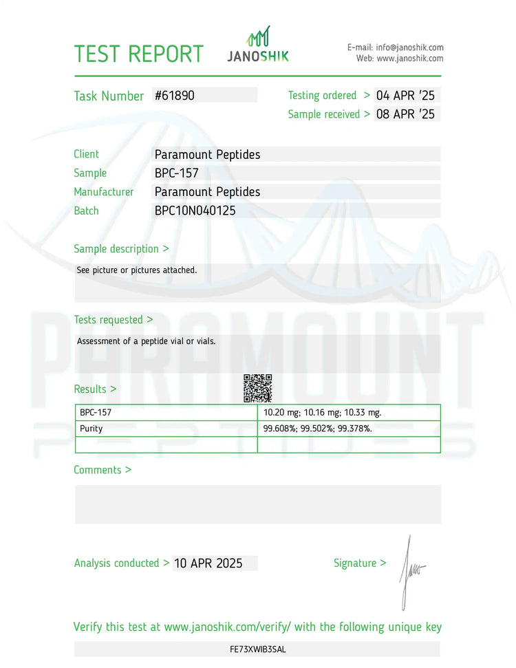 *Issued under Paramount Peptides, the authorized testing and distribution partner.