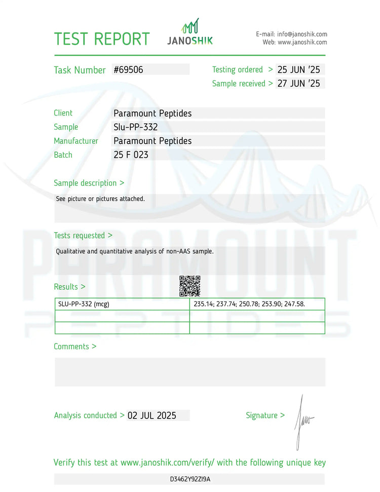 *Issued under Paramount Peptides, the authorized testing and distribution partner.